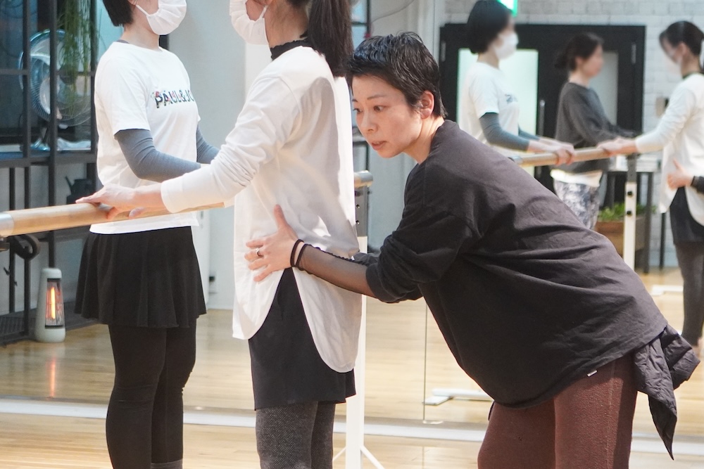 バーレッスンは基本は両手です、 主に姿勢を矯正していて直された生徒さんの背中がまっすぐ伸びていきました。