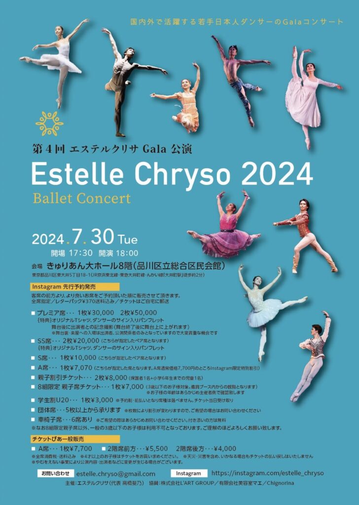 7月30日、バレエジャポンにて以前インタビューさせていただいた川添智香さんがご出演された公演、「第4回 エステルクリサ Gala 公演」にお伺いして参りました。この公演は、若手ダンサーたちの才能が光り、主催・代表の高橋斐乃さんの下で行われた華やかな舞台です。「エステルクリサ」という言葉には「どんな状況でも歩みを止めず進み続ける」という意味が込められているそうです。